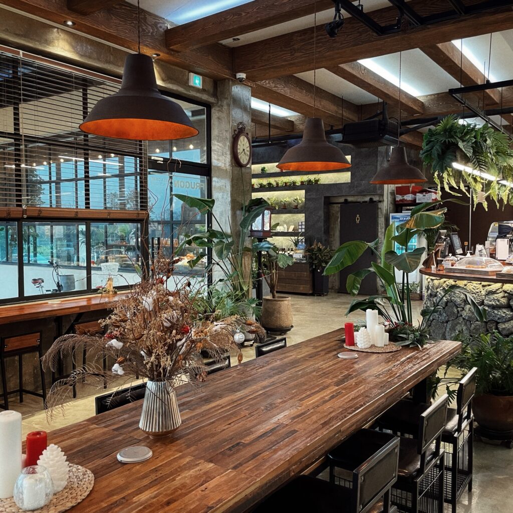 애월에 위치한 넓은 잔디밭이 인상적인 카페. 내부의 인테리어도 식물을 활용하여 자연친화적인 느낌을 준다.